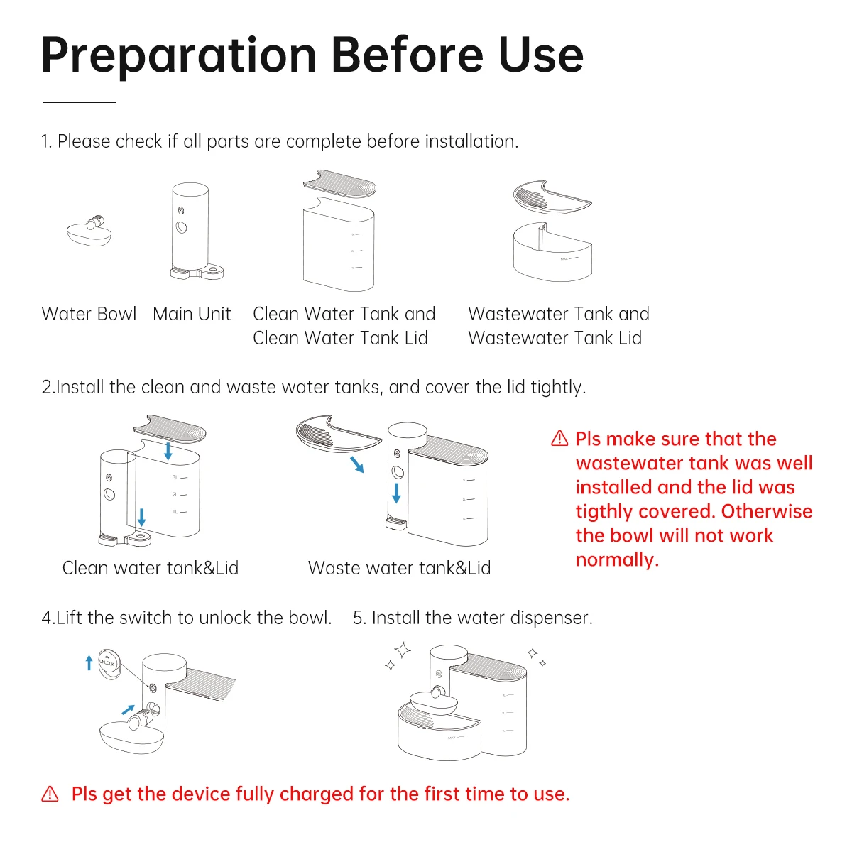 Check all parts before installation (main unit, water bowl, clean water tank, wastewater tank, and lids).
